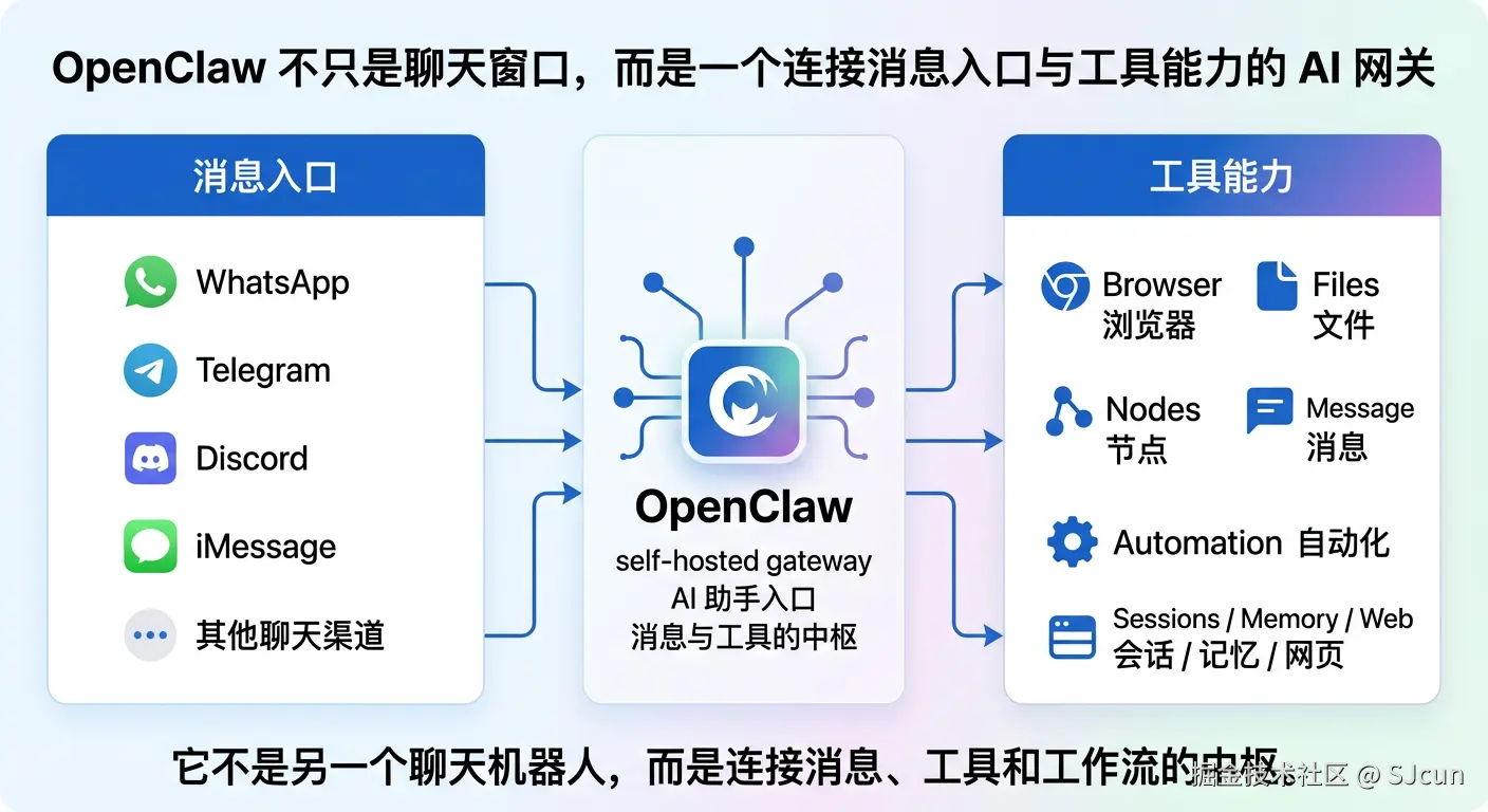 根据 OpenClaw 官方文档,它本质上是一个 self-hosted gateway(自托管网关) ,可以把 AI 助手连接到 WhatsApp、Telegram、飞书、iMessage 等聊天入口,同时还能接浏览器、节点、文件系统、消息发送等工具能力。 说白了,它不是"再做一个聊天机器人",而是在尝试把 AI 从"一个网页产品",变成"一个长期在线、可接消息、可调工具、可做事的个人助手"。