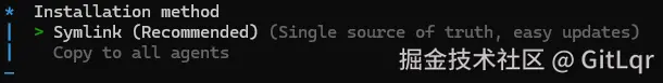 Copy to all agents选项,会将当前安装的 skill,拷贝到勾选的各个 agents 自己的 skills 目录下,这样会造成磁盘空间浪费,而通过链接的方式,可以节省磁盘空间。