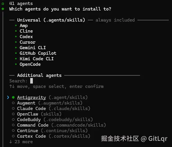 我电脑上安装了 OpenCode 和 Antigravity,所以,需要将 Additional agents 里的 Antigravity 也勾选上(按空格),回车。