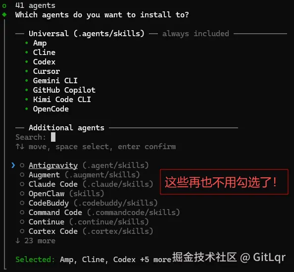 那么,这里再执行一次 npx skills,把 Additional agents 都去除吧,避免后面忘了。