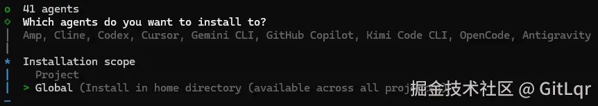 选择 Global,让这个 skill 安装到全局 skills 目录下(~/.agents/skills),回车。