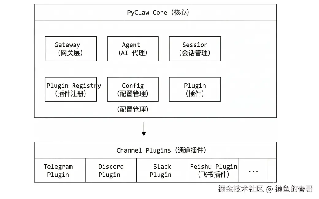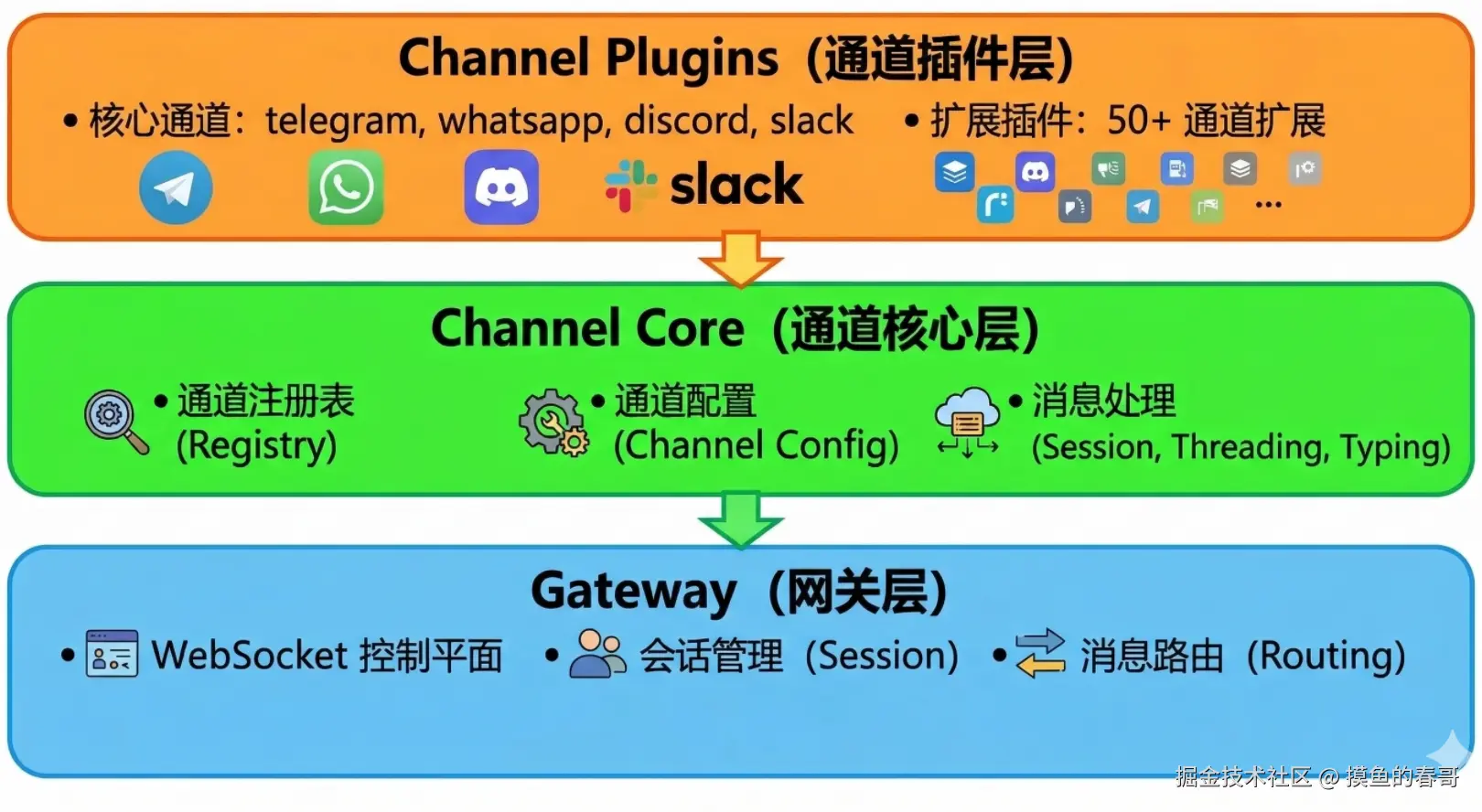 为了抹平几十种 IM 平台的 API 差异,OpenClaw 采用了一种经典的、高内聚低耦合的三层架构设计: