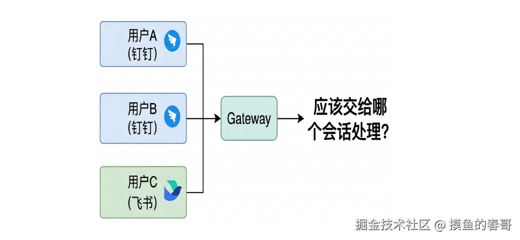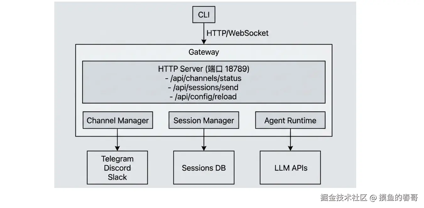 Gateway(网关层):作为整个系统的控制大脑。它负责维护 WebSocket 控制平面,进行全局的会话管理(Session),并决定消息如何被路由(Routing)到正确的目的地。