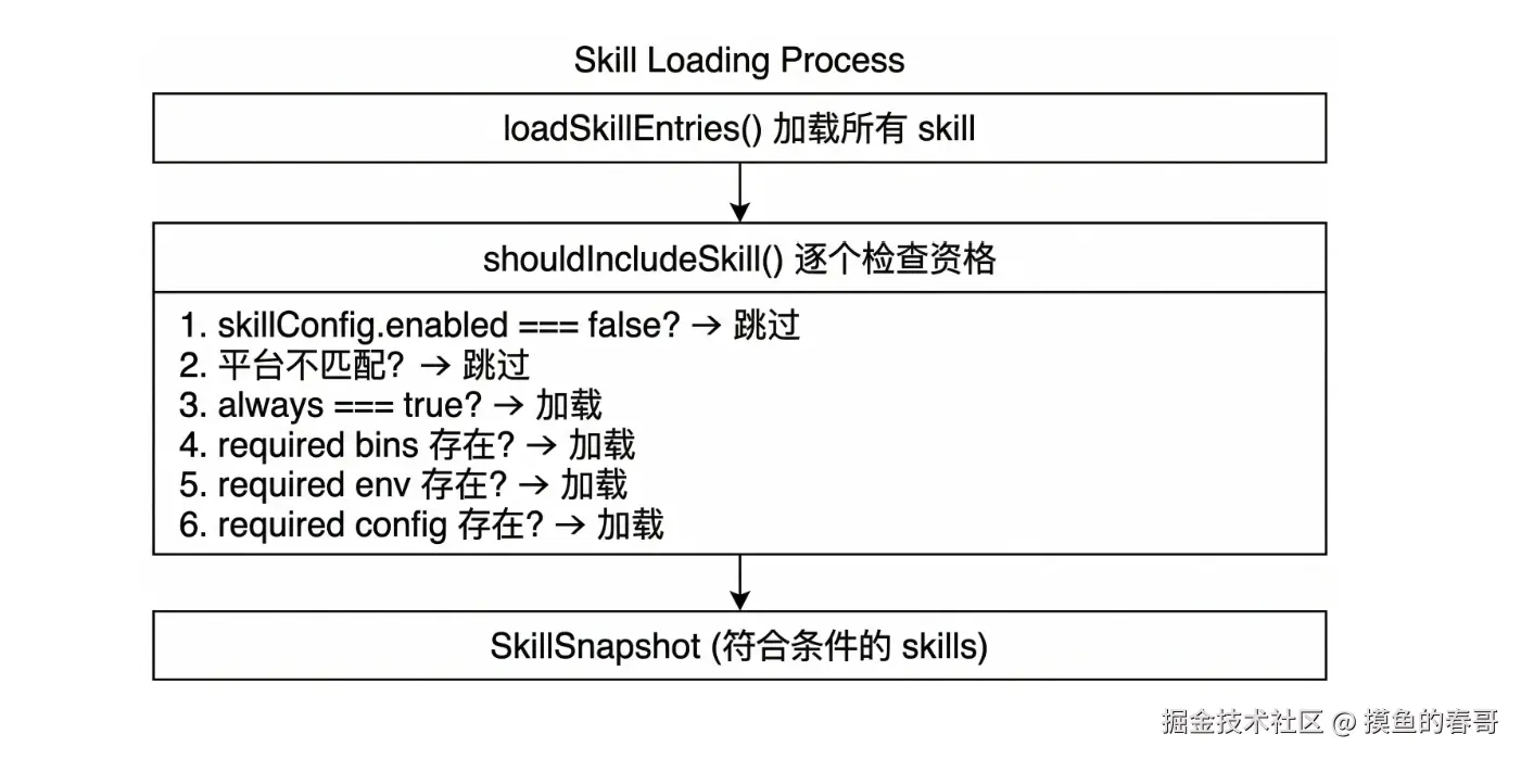 不是一次加载所有 skill,而是通过 Eligibility 检查 决定是否加载: