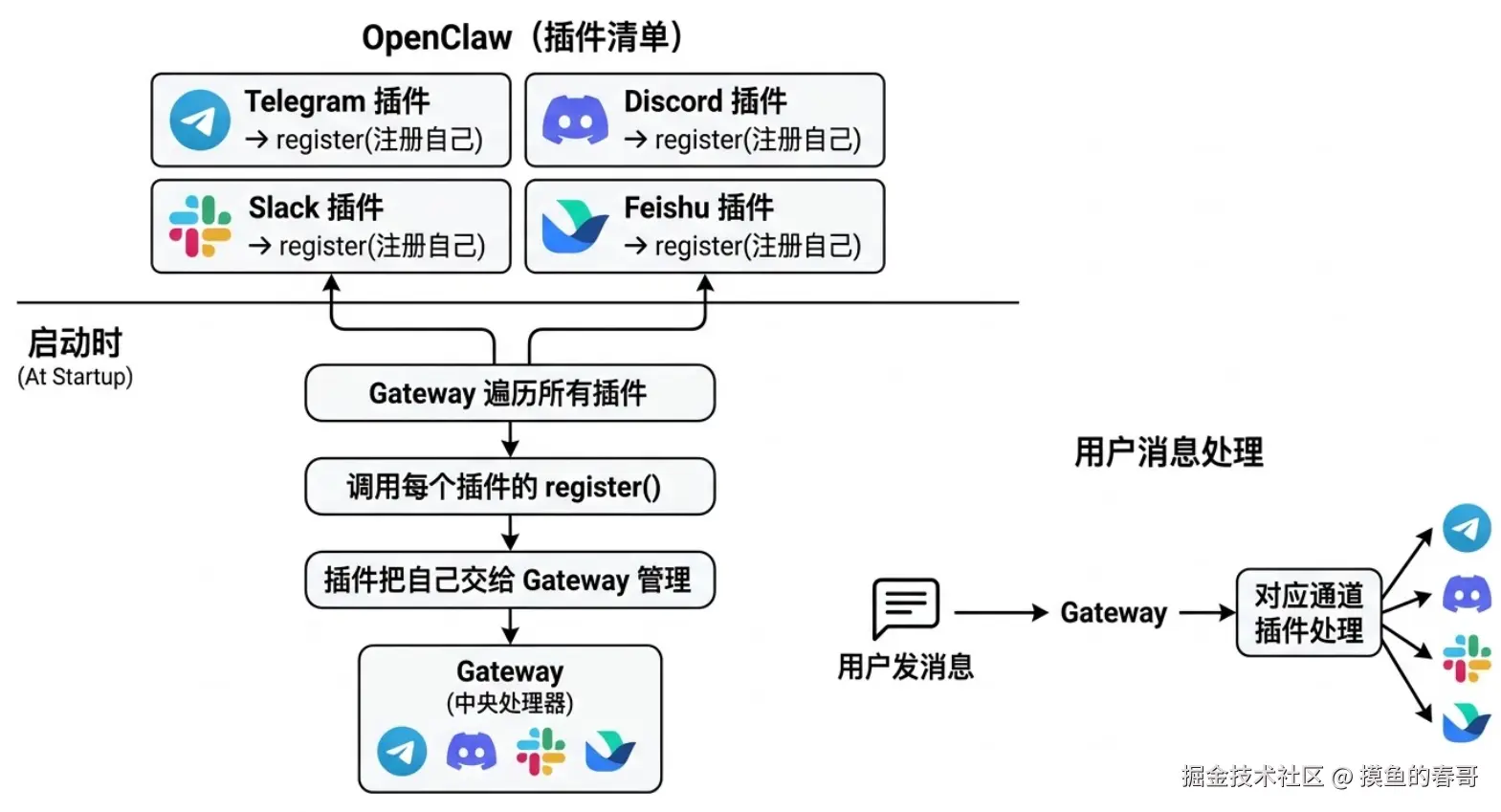 Channel Plugins(通道插件层):这里是"脏活累活"的执行地。无论是前面提到的 8 个核心通道,还是 50 多个扩展通道,都以独立插件的形式存在于这一层,负责与各个 IM 厂商的服务器进行底层网络交互。