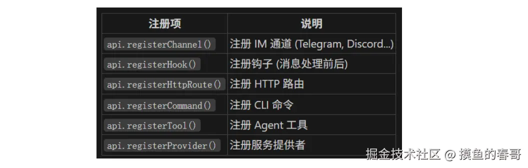 核心通道(8个):项目内置了对主流高频 IM 的支持,按照加载顺序包括 Telegram、WhatsApp、Discord、IRC、Google Chat、Slack、Signal 以及 iMessage。