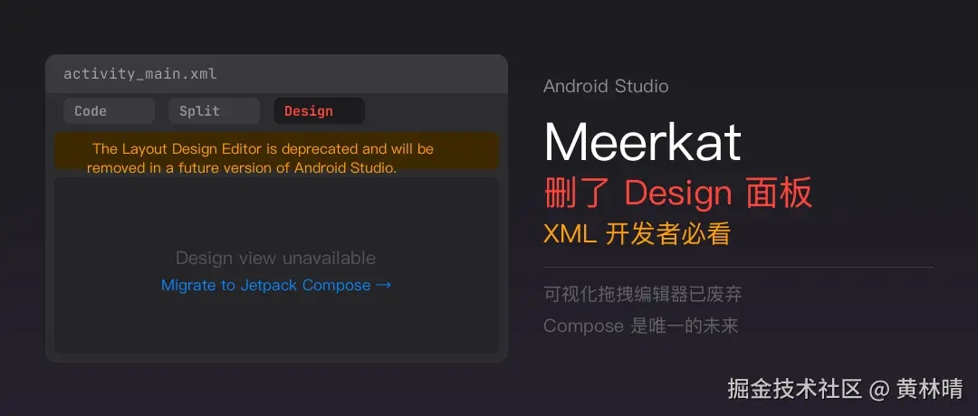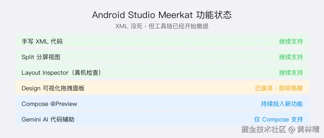 如果你的项目还在用 XML 写新 UI:短期内可以继续用 Code/Split 视图手写,Design 面板消失不影响编译运行。但这是一个明确的信号------Google 不再投资 XML 工具链。