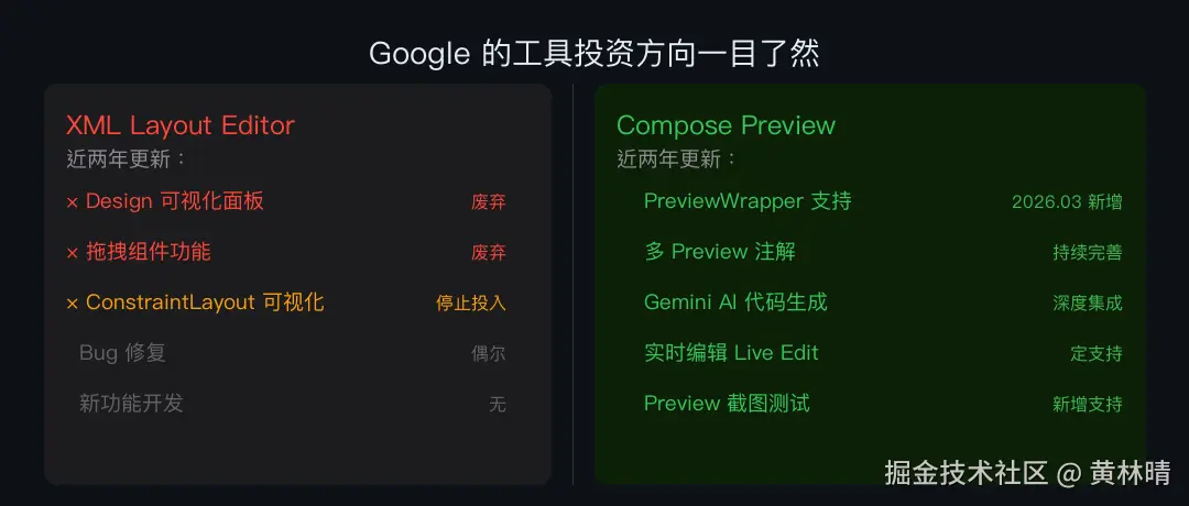 一边是越来越难维护的 XML 模拟渲染器,一边是和真机行为一致的 Compose Preview。资源有限,只能砍一个。