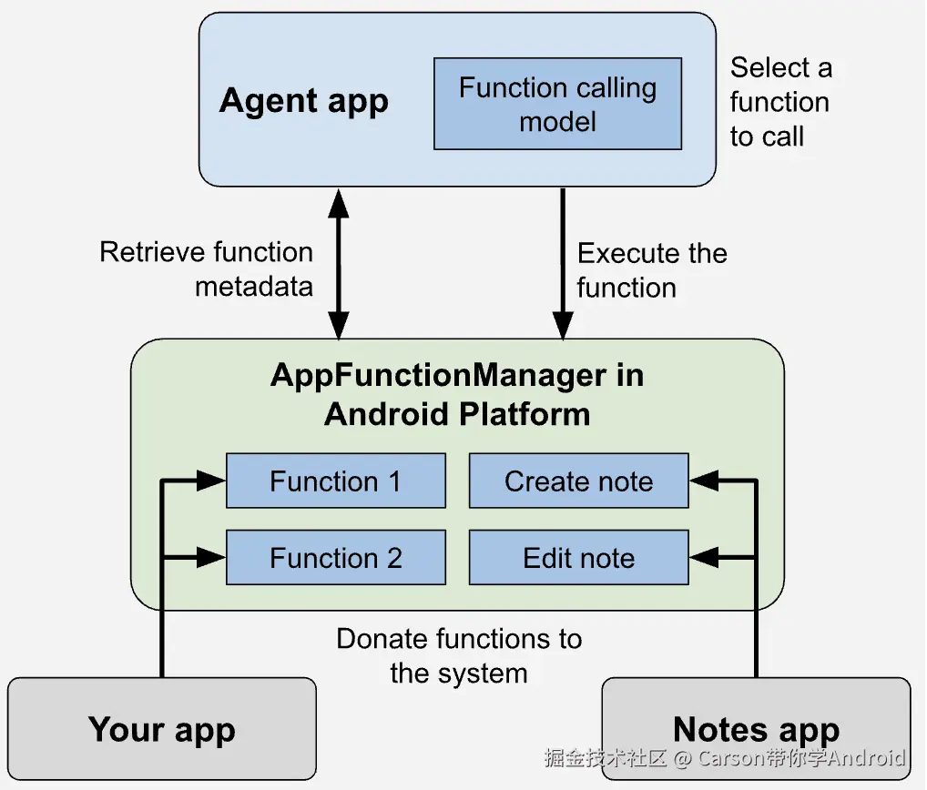- AppFunction 声明:Android 应用构建为公开其 AppFunction,例如"创建笔记"或"发送消息"。