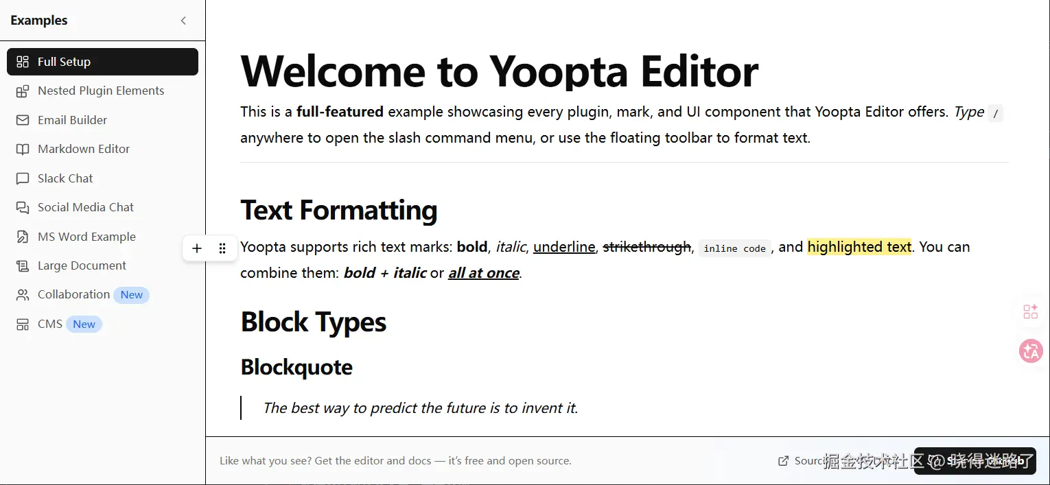 - Yoopta Editor 6.0:一款面向 React 的无头式富文本编辑器,用于打造基于区块的、Notion 风格的富文本编辑体验。它核心为无头(Headless)架构设计,但同时内置了丰富的 UI 组件,可帮助开发者快速上手。