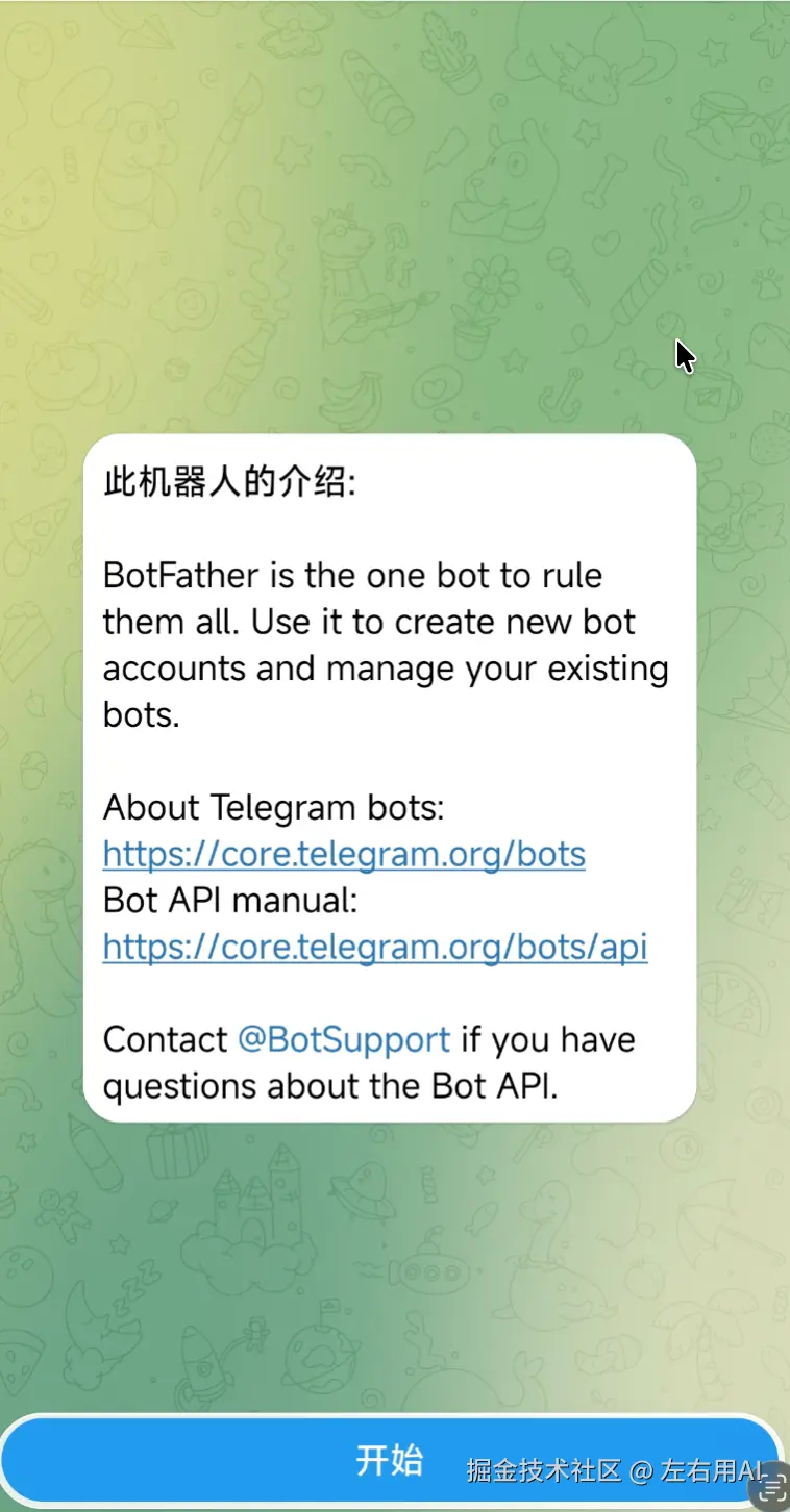 点进 BotFather,点击底部的**「开始」**按钮。