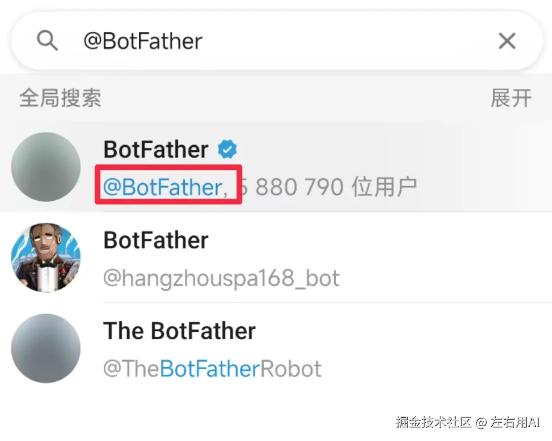 打开 Telegram,在顶部搜索框里输入 @BotFather。