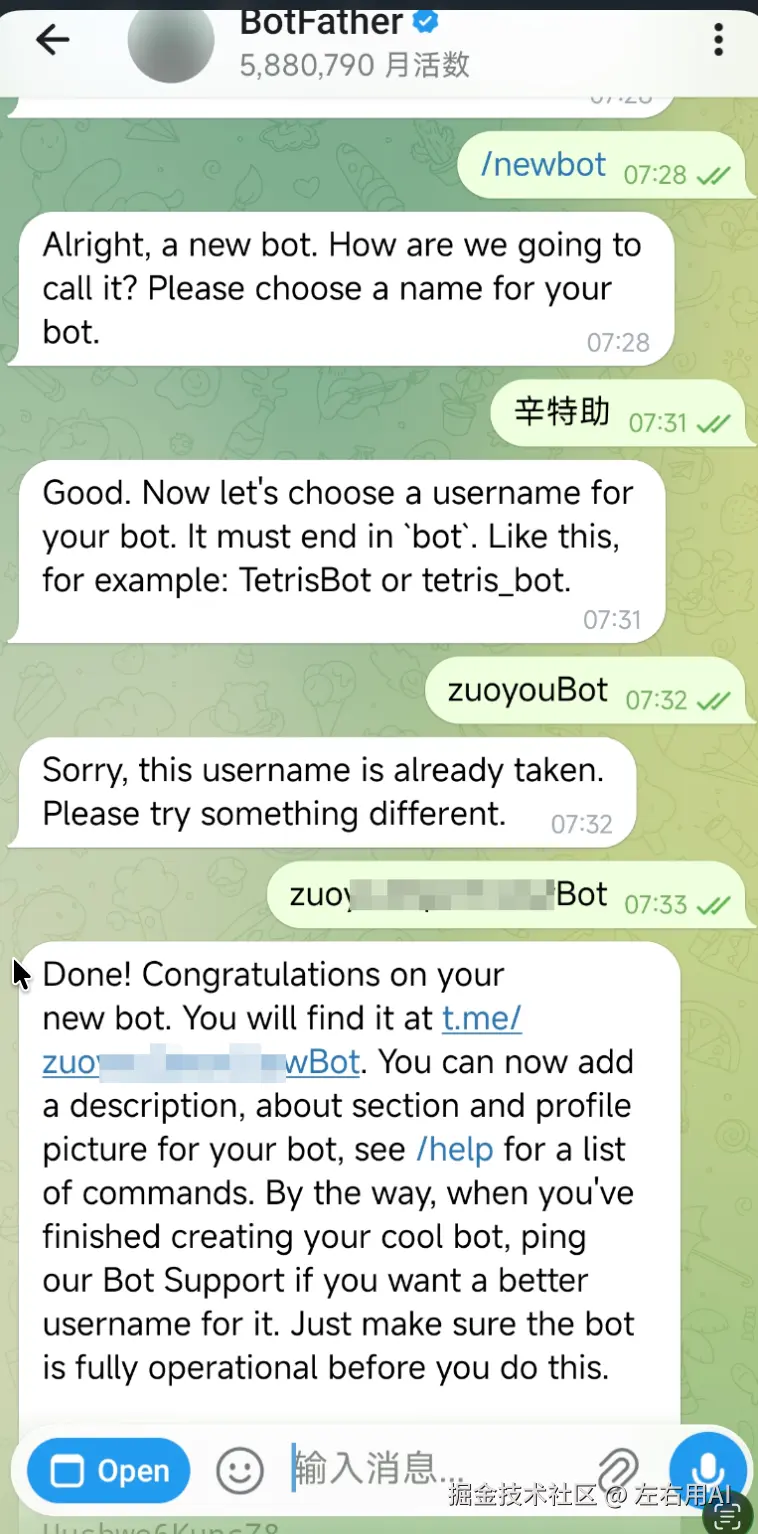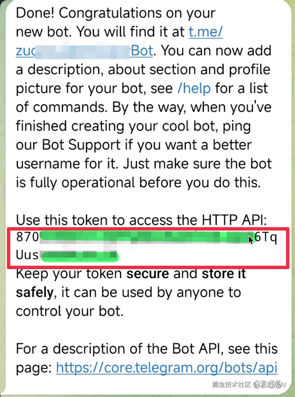创建成功后,BotFather 会返回两个关键信息: