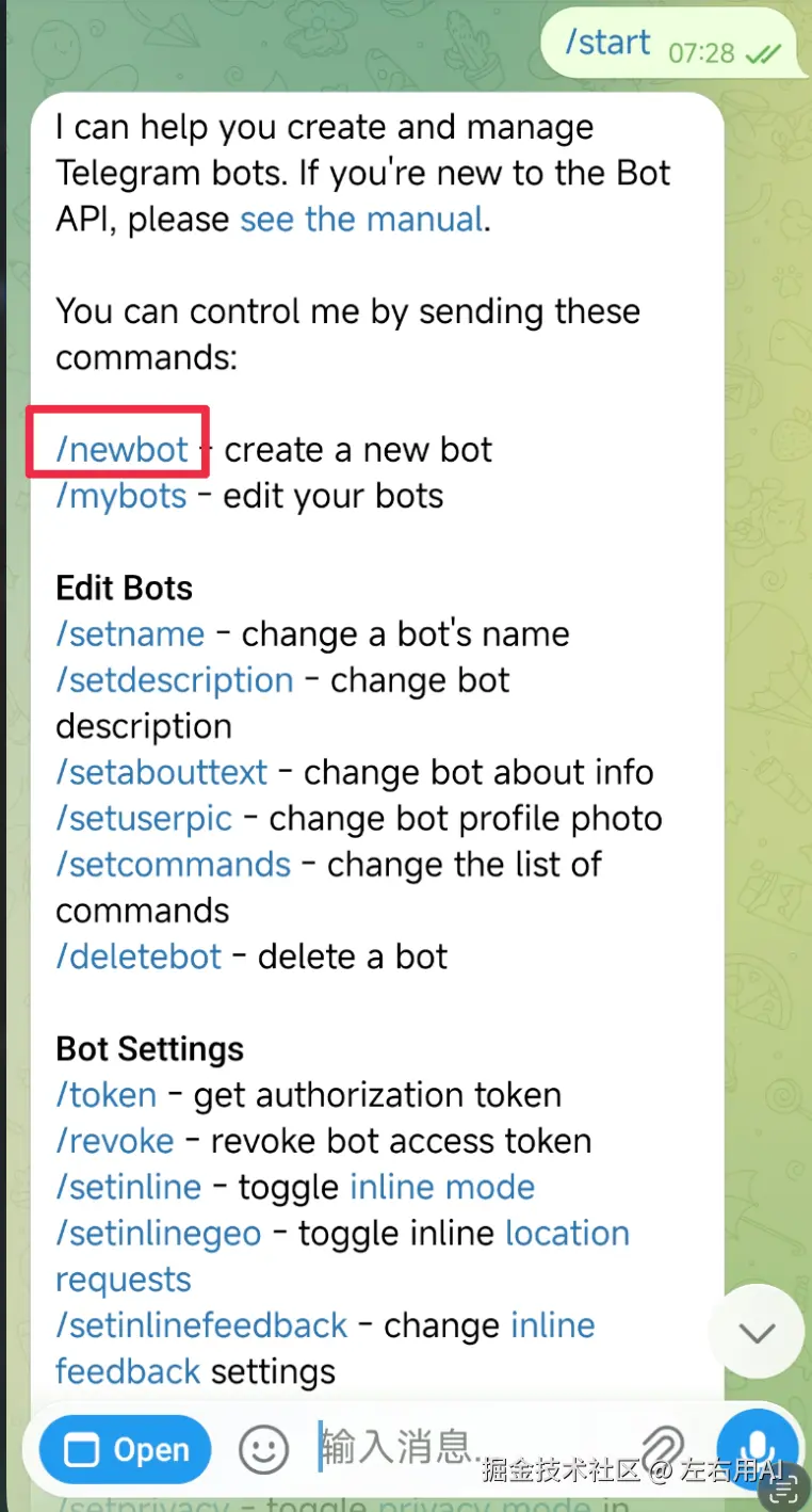 它会弹出一堆介绍信息。别管那些,直接点红框里的快捷命令 /newbot。