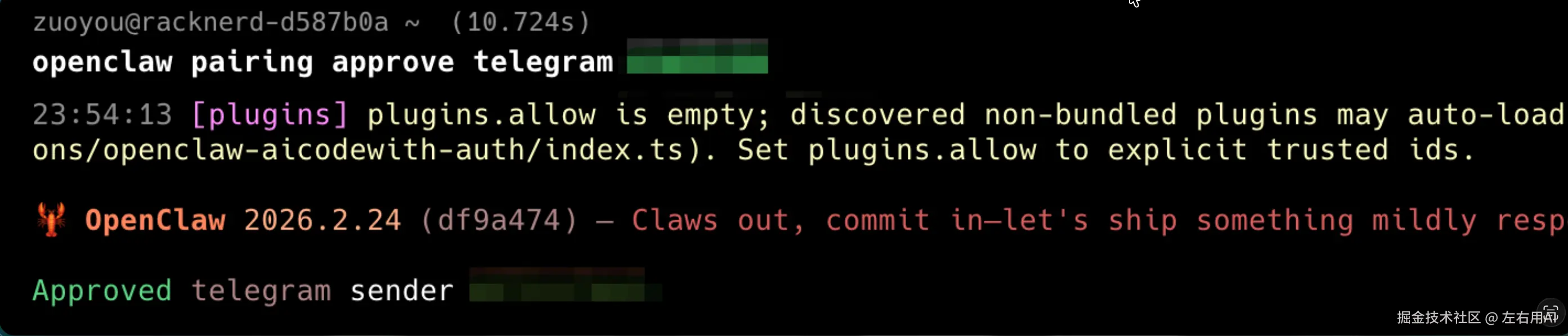 看到 Approved telegram sender ------ 配对完成。