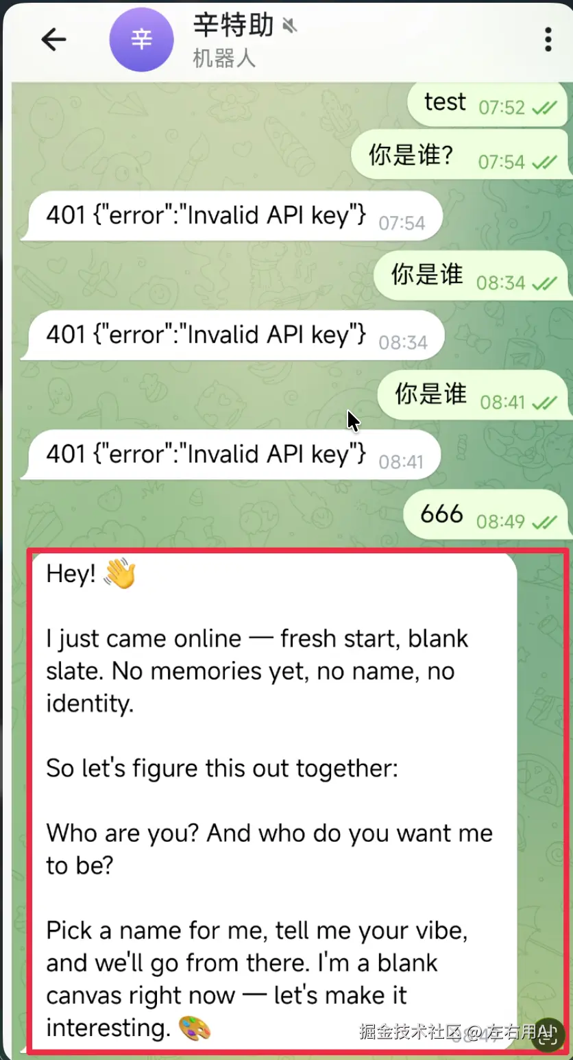 现在,回到 Telegram,随便发一条消息试试。