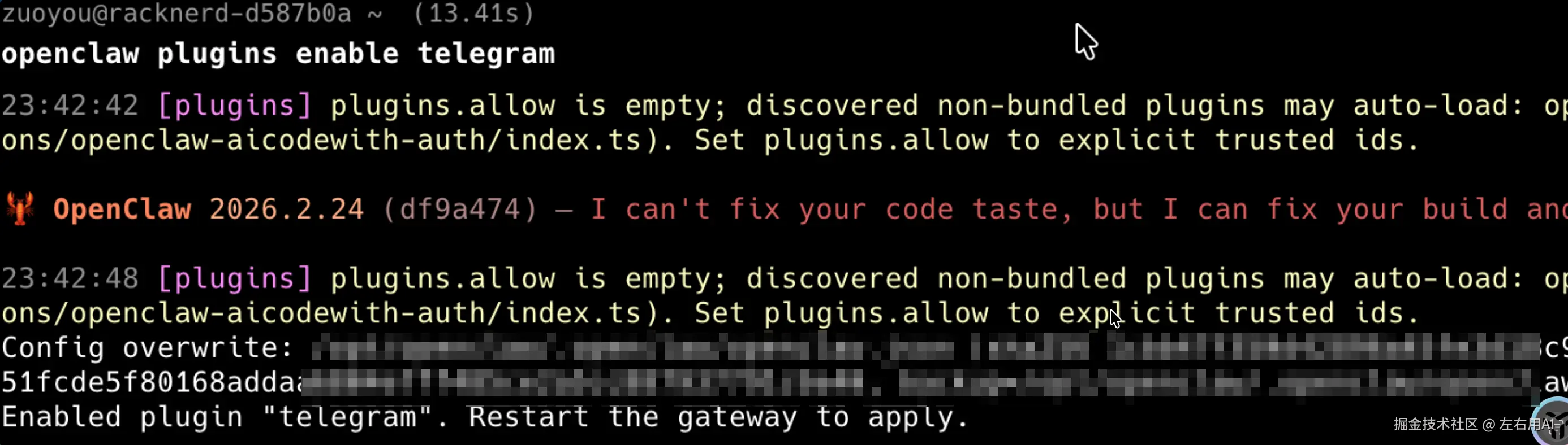回到服务器,我们要做两件事:开启 Telegram 渠道,然后把 Token 告诉小龙虾。