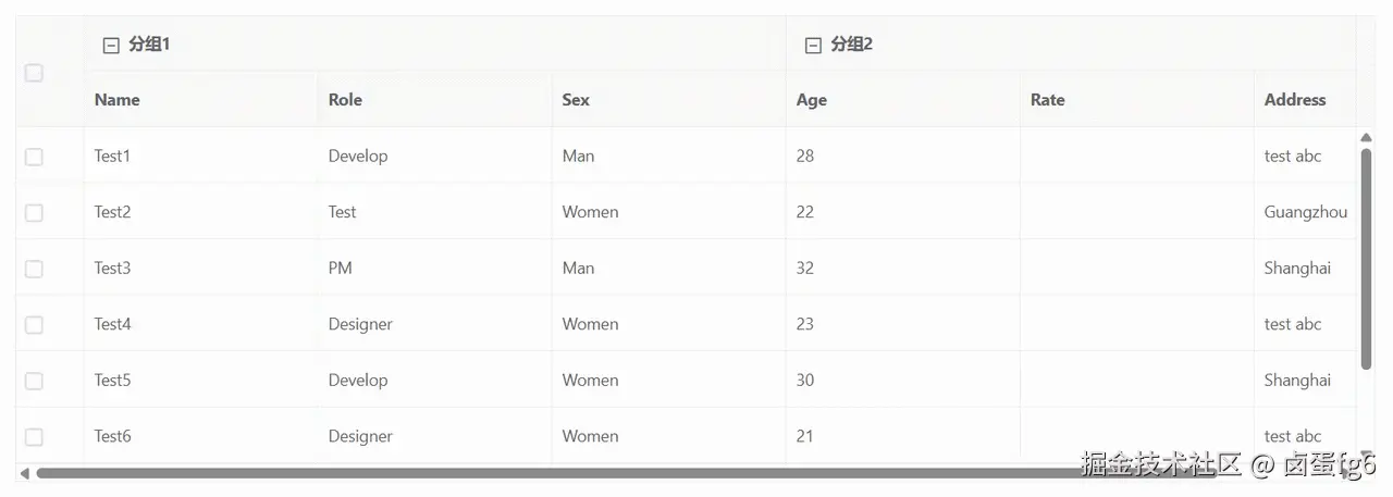 { id: 10001, name: 'Test1', role: 'Develop', sex: 'Man', age: 28, address: 'test abc' },
