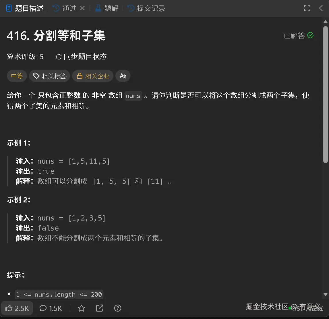 而力扣上的"分割等和子集"416. 分割等和子集 - 力扣(LeetCode)