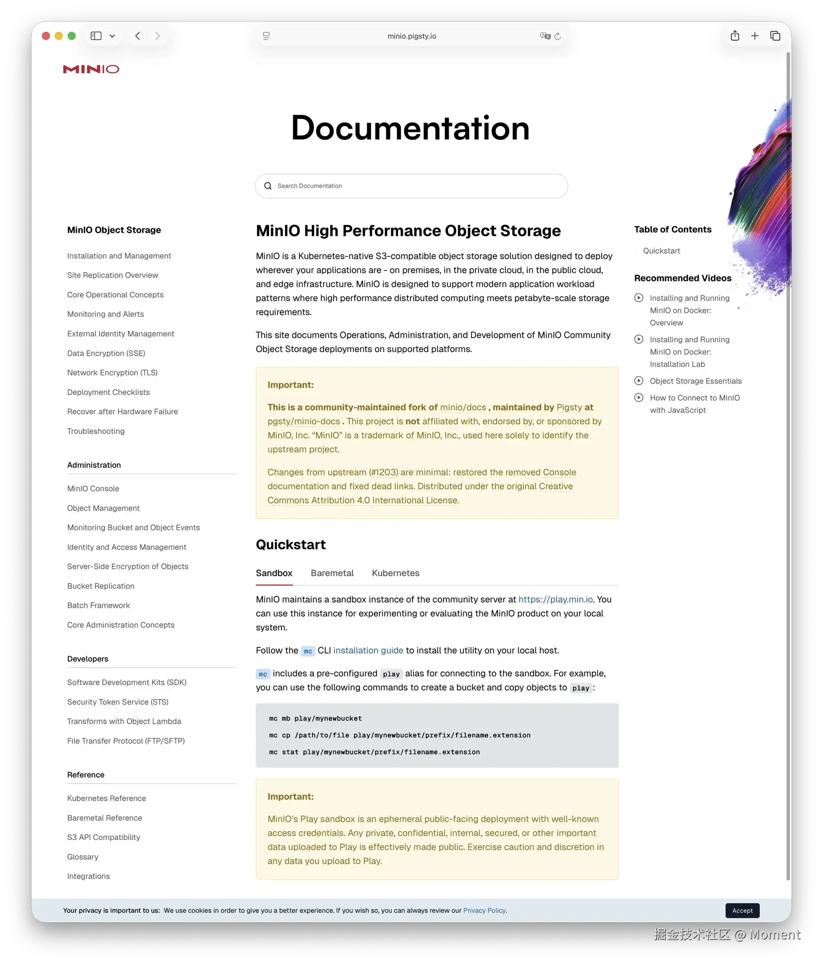 我们分叉了 minio/docs,修复了损坏的链接,恢复了被删掉的控制台文档,并把整个站点部署在 这里。