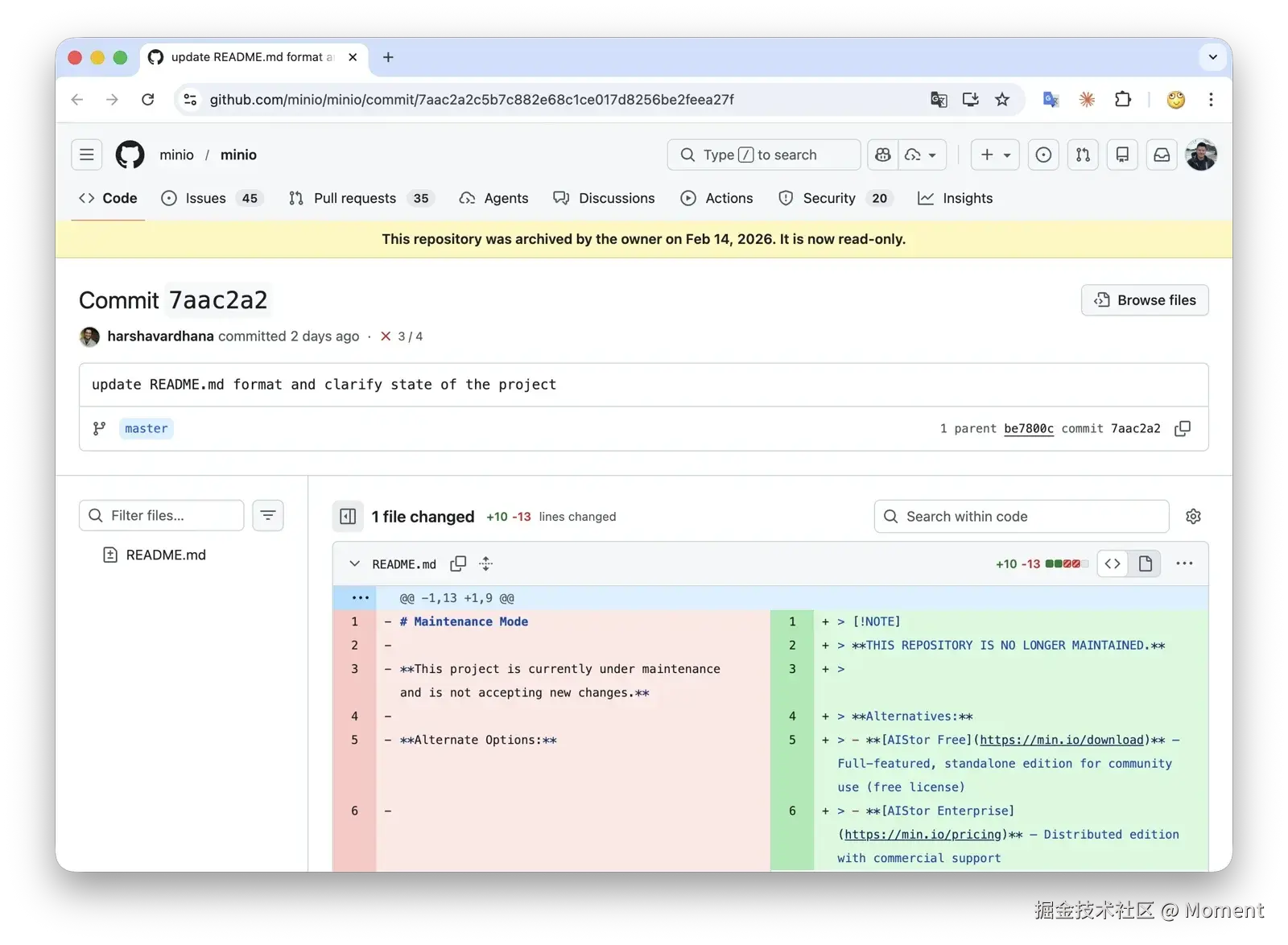 2026 年 2 月 12 日,MinIO 又把仓库状态从 "维护模式" 更新为 "不再维护",随后直接将仓库归档。