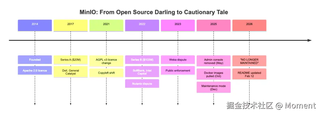2026 年 2 月 14 日,一篇广为流传的文章《MinIO 如何从开源宠儿变成警示故事》给出了完整的时间线:MinIO如何从开源宠儿变成警示故事。