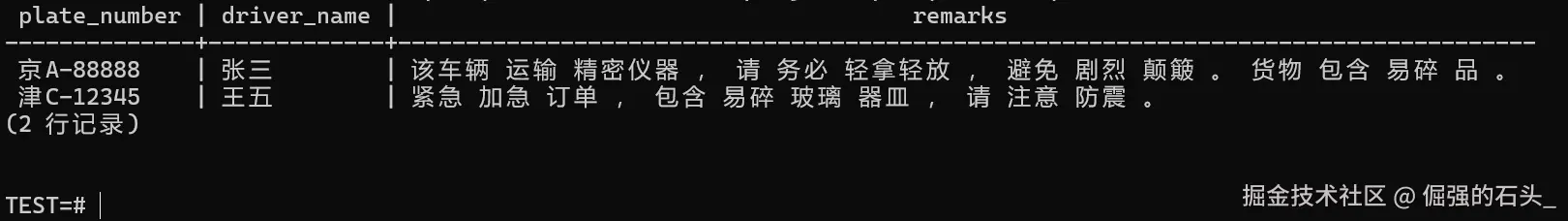 driver_info(JSONB)。用来存司机画像、实时传感器数据。 - 非结构化文本 :