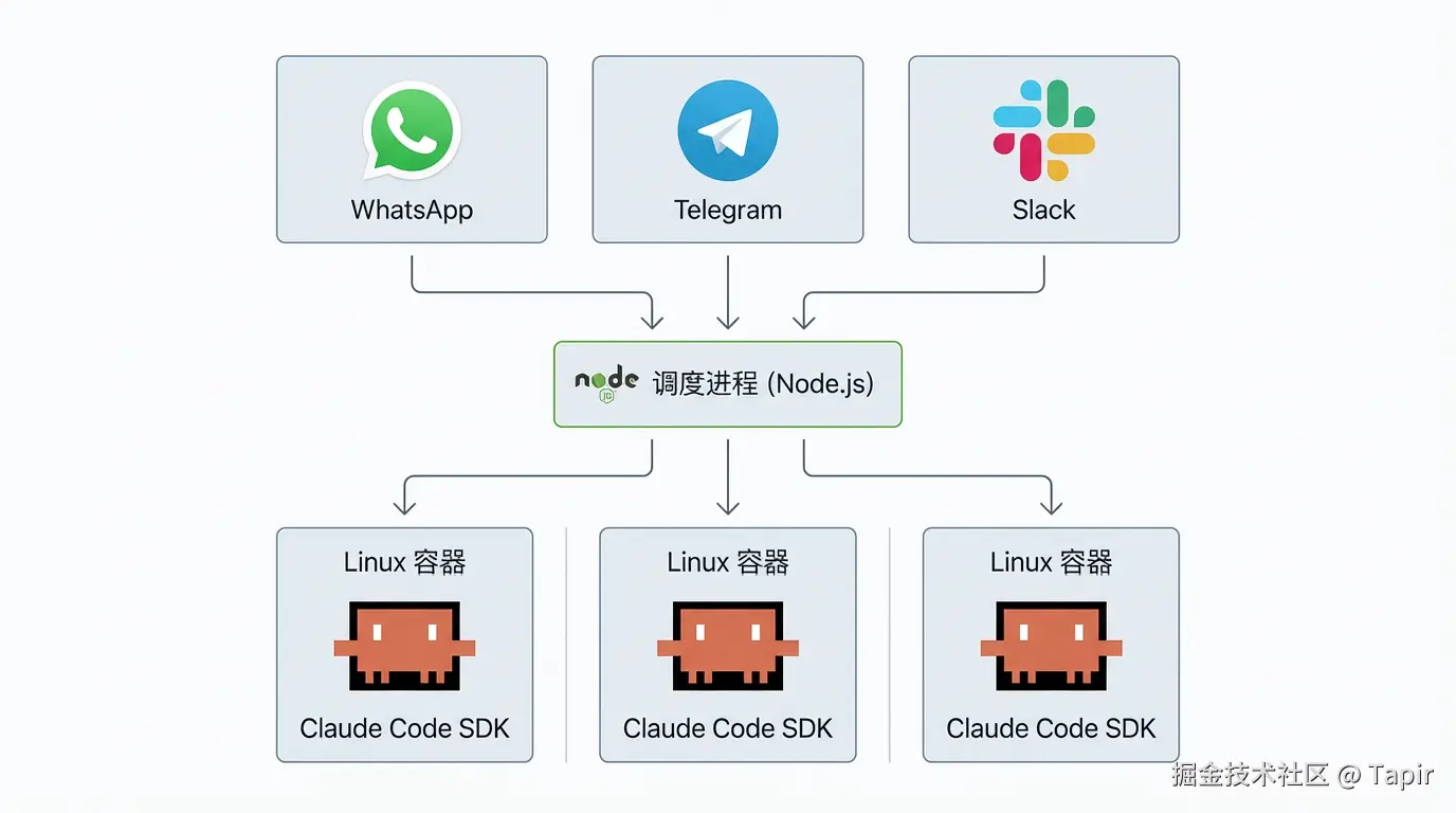 NanoClaw 的架构本质上就是一个 Node.js 调度进程 + 若干隔离的包含 Claude Code 的 Linux 容器。