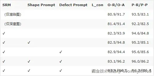 这意味着:只有异常提示携带了缺陷的几何特征描述。 当视觉特征与异常提示的相似度更高时,模型就能判断"当前区域的视觉表现与3D几何缺陷的描述更匹配",从而实现更精准的检测。