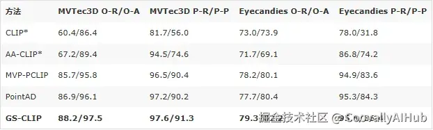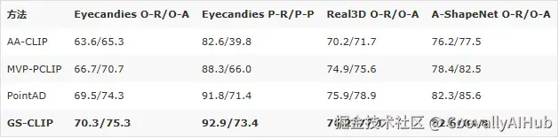 RGB 图像提供了渲染图和深度图所缺失的真实色彩和精细纹理信息,对检测表面划痕、污渍、变色等缺陷至关重要。GS-CLIP 在多模态设置下依然取得最优,MVTec3D-AD 上 O-AUROC 达 88.2%,Eyecandies 上达 79.3%。