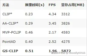 从实用角度看,GS-CLIP 在跨数据集设置下的稳健表现令人印象深刻。工业场景中最头疼的问题就是"换一种产品就要重新训练",GS-CLIP 的强泛化能力让它离实际落地更近了一步。不过,计算开销是需要关注的问题------0.51s 的推理时间和 5872MB 的显存占用相比 PointAD(0.40s、4275MB)有明显增加,在对实时性和资源敏感的产线部署场景下,如何在保持精度优势的同时优化效率,是后续值得探索的方向。