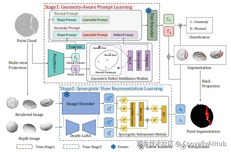 第一阶段:把3D几何信息"翻译"成文本提示,让CLIP的语言端理解几何异常长什么样。 第二阶段:让渲染图和深度图双流并行处理并深度融合,让CLIP的视觉端看得更全面。