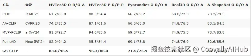 跨数据集设置涉及物体语义、背景、采集方式(真实/合成)的显著偏移,是更严格的泛化能力测试。GS-CLIP 依然保持领先,且相比 one-vs-rest 设置性能下降极小,说明几何先验和双流融合赋予了模型更强的跨域泛化能力。