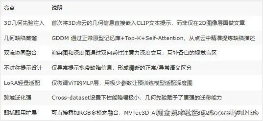 GDDM 的设计尤其值得关注。它不是简单地把所有点特征都塞进提示里,而是通过"正常原型记忆库→异常评分→Top-K筛选→Self-Attention聚合"这一精心设计的流水线,让模型只关注真正可疑的几何区域。 消融实验也清晰地验证了这一设计的有效性------Defect Prompt 对点级定位的提升是所有组件中最大的。