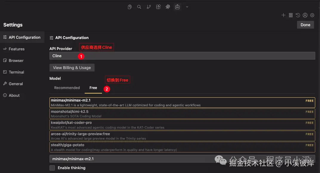 登录Cline账号,点击【设置】进入到Cline设置界面,【API Provider】选择"Cline",【Model】切换到"Free"就可以看到Cline提供的免费模型了