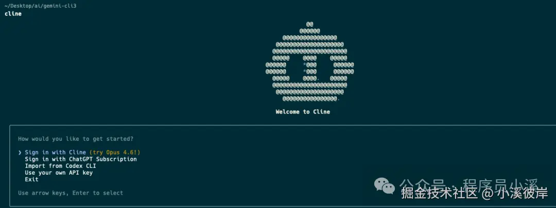 安装完成后,在命令行终端输入 cline 启动CLI,首次使用需要进行授权,选择自己喜欢的授权方式进行授权