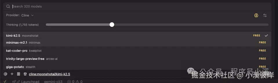 Cline中已经提供了多种免费模型,此次更新又新增了Minimax-2.1 and Kimi-k2.5: