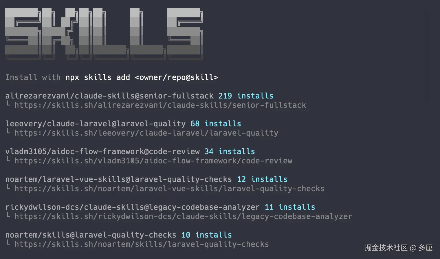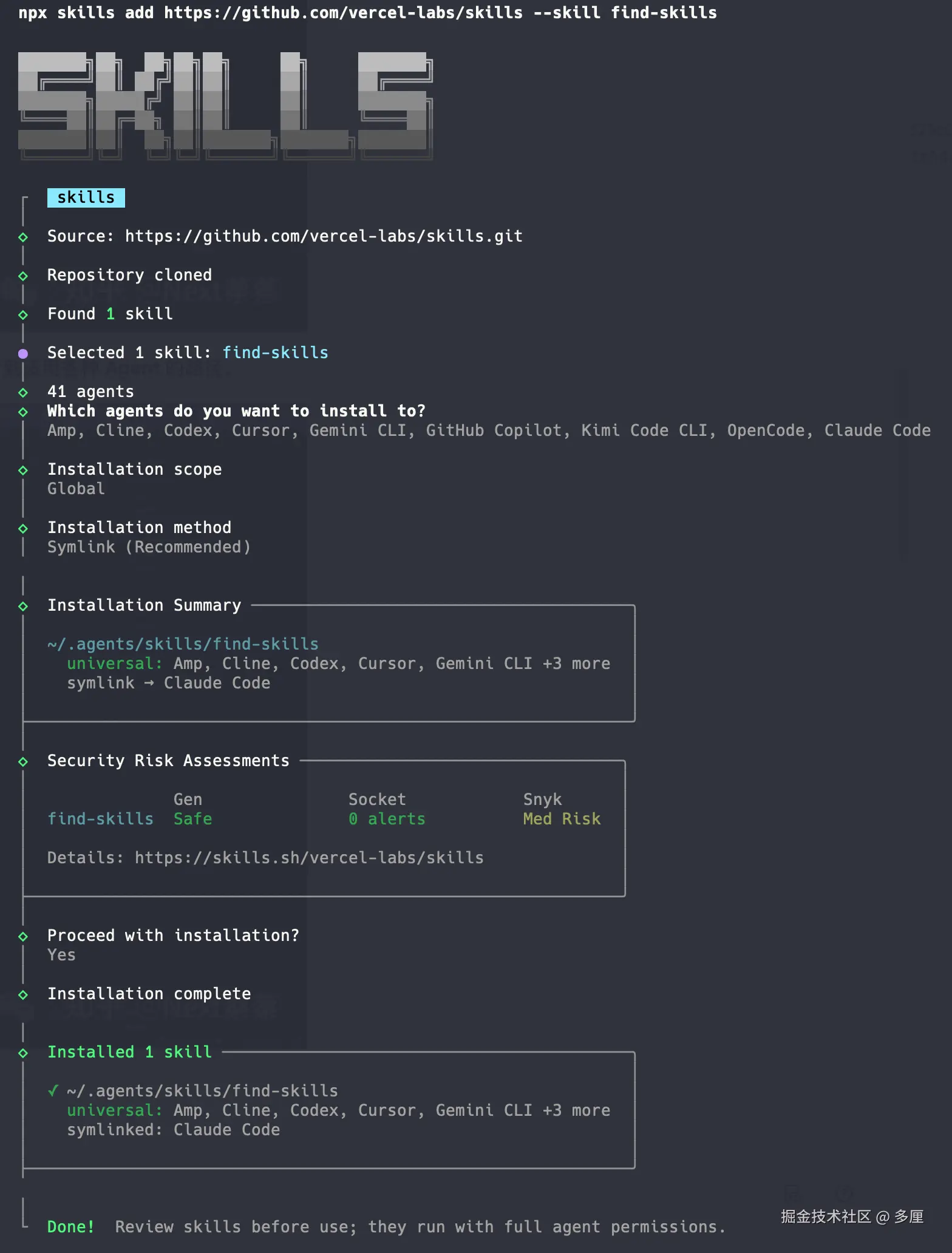 find-skills 解决了我们找 skills 的难题, 并且可以直接安装到 Amp, Cline, Codex, Cursor, Gemini CLI, GitHub Copilot, Kimi Code CLI, OpenCode, Claude Code 等等工具中方便复用.