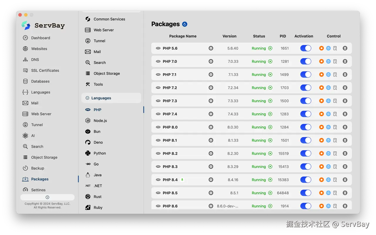 ServBay 支持多个 PHP 版本同时运行,能够一键安装 PHP 环境,并且能随时切换,方便在不影响现有项目的前提下测试 PSL 5.0 的新特性。