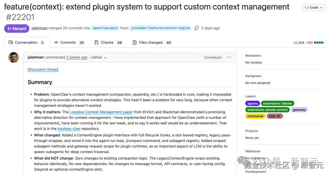 翻译成人话:开发者现在可以在不修改 OpenClaw 核心代码的情况下,完全自定义上下文的处理逻辑。你想用 RAG?可以。想做激进压缩?随意。想让不同子任务拥有隔离的记忆空间?接口都给你准备好了。