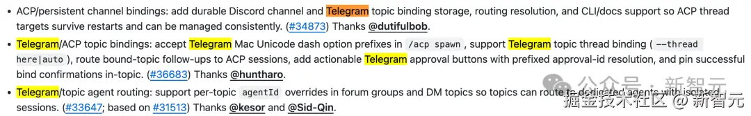 Discord 端修复了断连后无法恢复的死机问题,优化了频道解析和机器人心跳检测。Telegram 端新增了主题级别(Topic)的智能体路由隔离------这意味着你可以在同一个 Telegram 群组的不同主题里,分别运行不同的 AI 智能体,互不干扰。