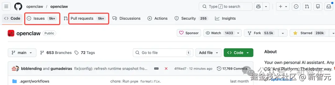 顺带一提,OpenClaw 不仅 Star 数狂飙冲向 3w+,而且 issues 和 pr 数量也是冠绝全球。