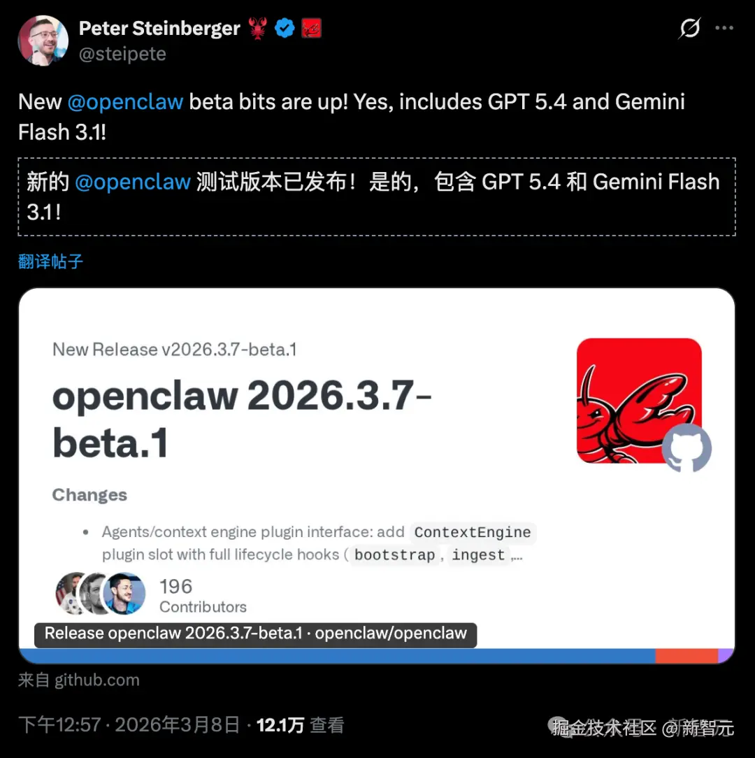 就在刚刚,OpenClaw 官方发布了全新 v2026.3.7-beta.1 版本,创始人 Peter Steinberger 亲自下场在 X 上高调官宣。