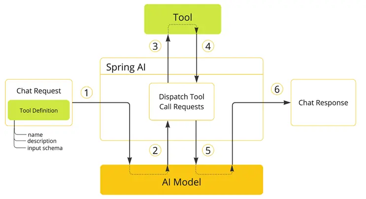 - 模型如果觉得需要调用工具就会返回相关的工具调用消息,这个时候SpringAI会基于这个消息去调用工具,得到一个工具调用的结果给到模型。