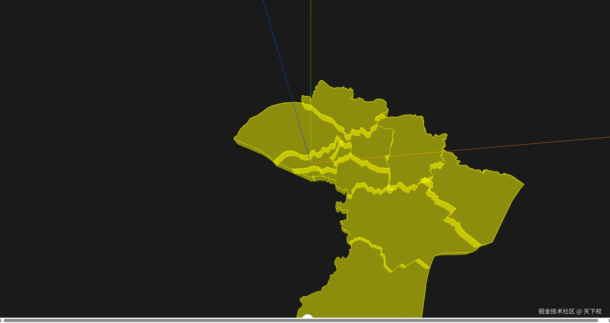 地理信息可视化一直是前端领域的热门话题。传统的 2D 地图已经无法满足我们对于视觉效果和交互体验的追求,而 3D 地图则可以提供更直观、更震撼的空间认知。本文将带你从零开始,在 Vue 项目中结合 Three.js 和 D3.js 的地理投影模块,将一个普通的 GeoJSON 文件转化为可交互的 3D 挤出地图,并支持旋转、缩放等操作。最终效果是一个具有立体感和边缘高亮的苏州各区地图。