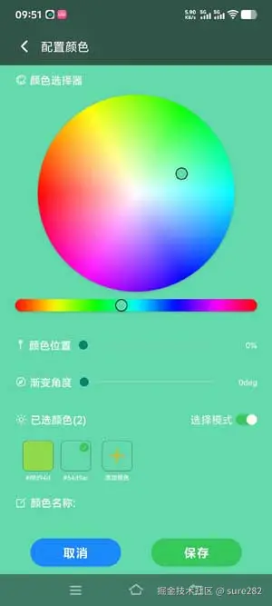 渐变角度则是整个渐变色的配置,因此整个渐变色结果对象中只需要一个角度值。因此我们需要在创建渐变色时应该保存:渐变颜色n个,颜色位置n个,渐变角度1个: