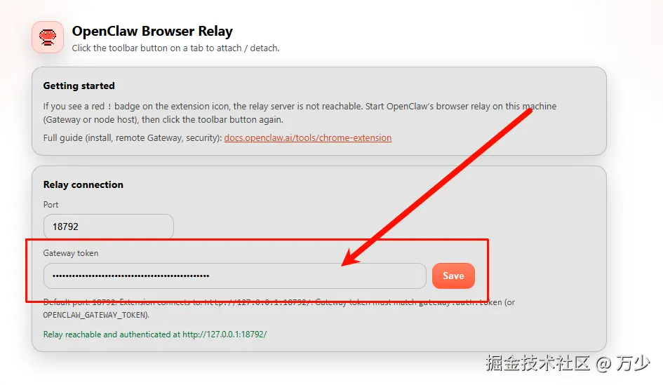 OpenClaw Browser Relay插件,粘贴进去你的 token配置