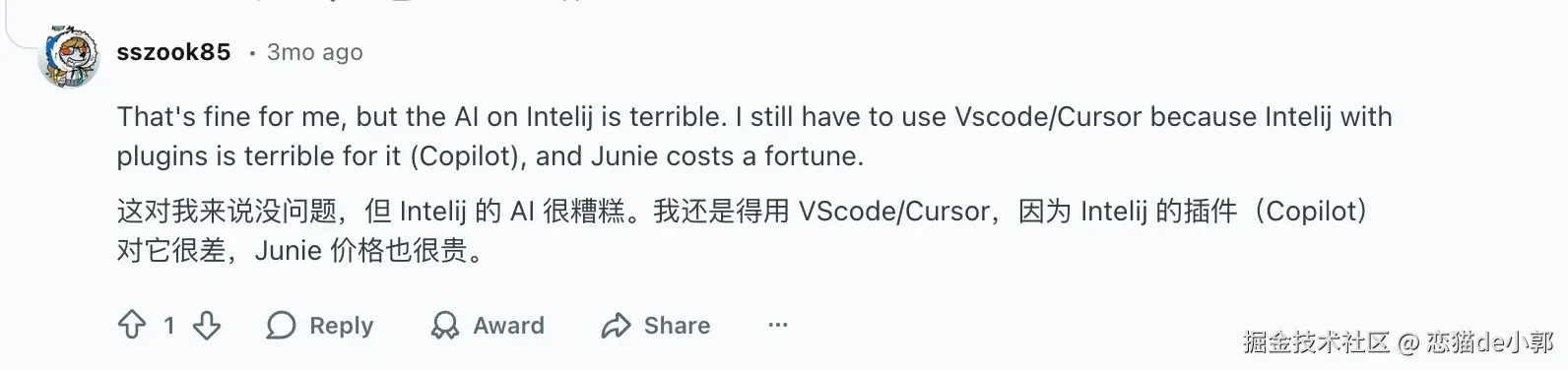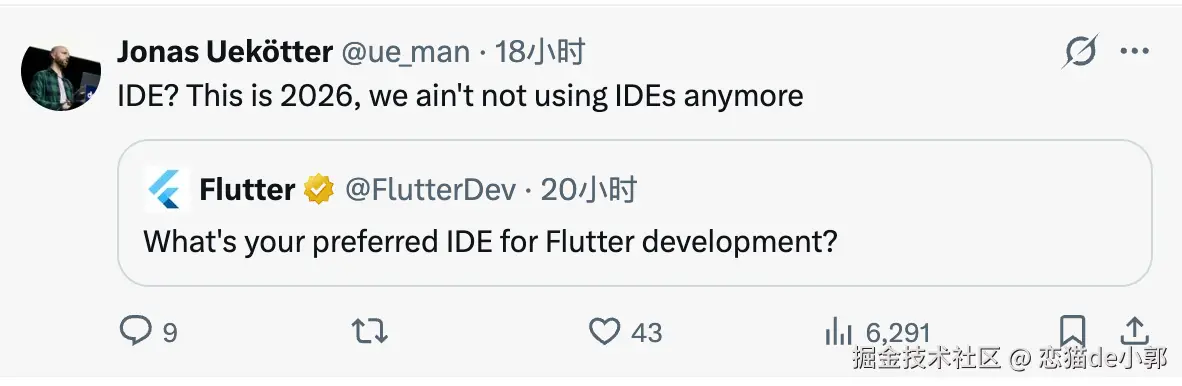 一些老用户的反馈也很真实,虽然 VSCode 在 IDE 层面不够好用,但是 AI 时代这不重要,Junie 带不了比 Cursor 的体验和效率,而这一切也体现在 JetBrains "动作太慢了",也许是时代变化太快了,比如现在 Cursor 也在担心 Claude Code 和 Codex 的冲击了: