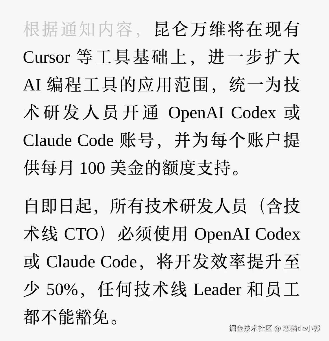 当然要聊的不是这个事,而是「管中窥豹」,通过和这个事我们可以看到,现在不少企业已经在企业内部推广 AI 开发链路 ,另一个典型就是近期舆论风口的「昆仑万维 」,他们在 Cursor 的基础上,进一步扩大到了 OpenAI Codex 和 Claude Code 平台 ,并要求开发提效: