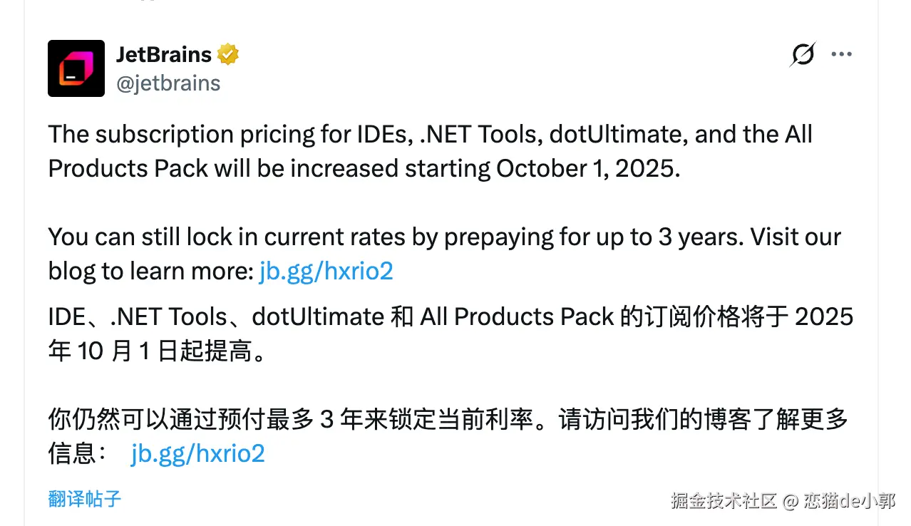但是这些可以拯救得了 JetBrains 的市场吗?未来 IDE 市场是否能维持下去还未知?但是 JetBrains 却是在 2025 年订阅价格上调 20% ,这个做法看起来是想让你提前预付来对冲,但是这个行为放现在看就显得有些无法理解: